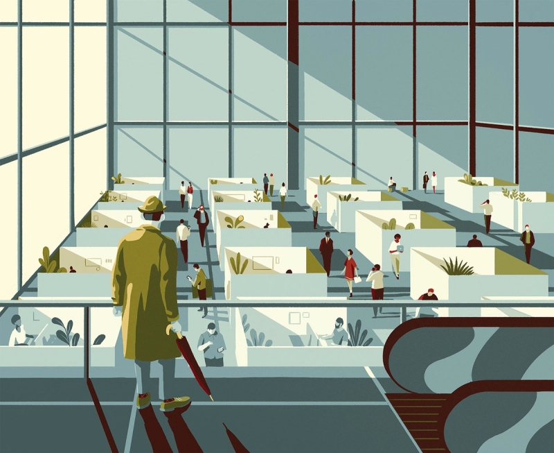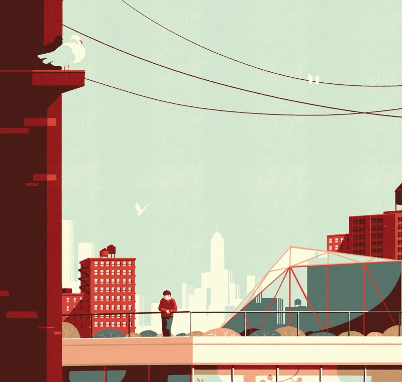 His use of light and a pastel cooler palette makes his work is reminiscent of American illustration from the 1950's and ‘60s. Using light as a tool for picking out specific detail, he casts beams upon cigarette smoke, snowy hilltops and windows to direct your eye to what you really need to see.