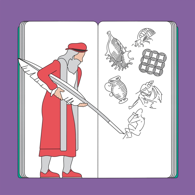 Following a VIP tour and site visit, Andrew studiously immersed himself in the Library's brief, thoughtfully crafting each illustration with meaning and a touch of humour. He carefully depicted details like the distinctive round windows of the Members' Room and the Library’s study chairs, even contemplated the question: "Did Leonardo Da Vinci ever doodle?".