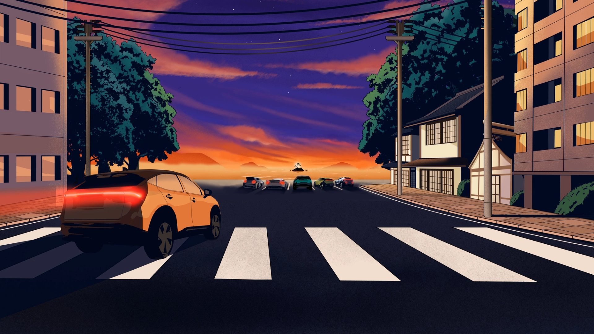 From here the viewer is accelerated the through the sun to the many worlds of future possibilities, from racetracks to mountains, blossom covered freeways to cyberpunk Tokyo nights.