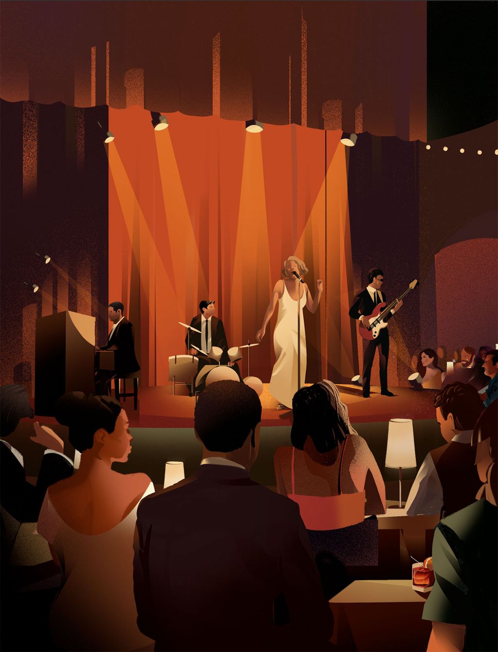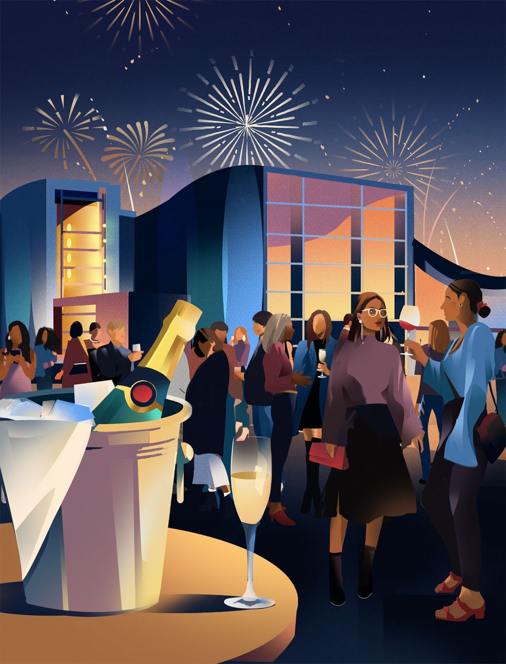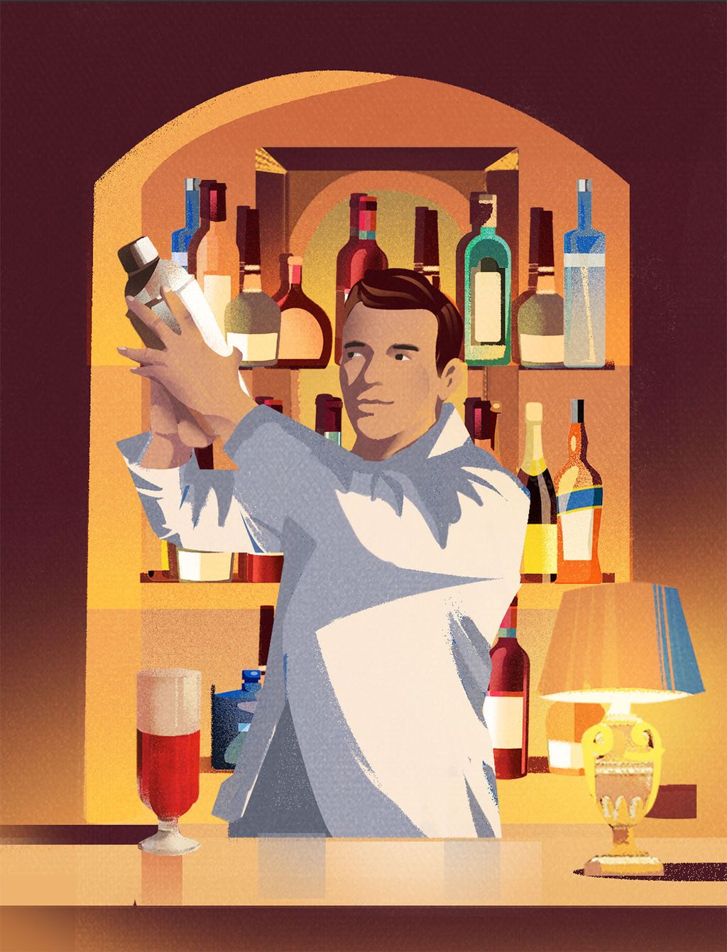 Using strong brush strokes, she evokes a strong sense of atmosphere and drama in her imagery. Her highly versatile style explores themes of irony, humour, and melancholy, with cocktails and canapes in abundance.